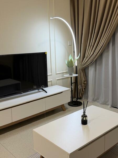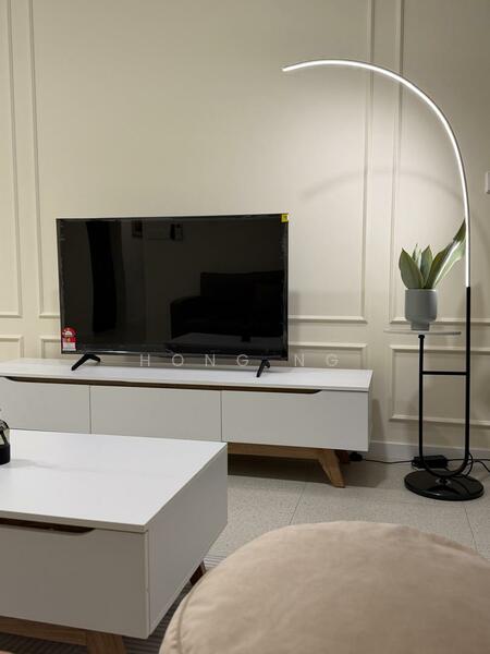 • Fully furnished living room with aircond, sofa, TV, cabinet, coffee table, rug carpet and lamp