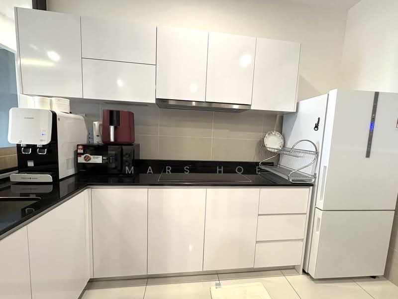 L-shape sofa, beds & wardrobes, wood-style dining table set, kitchen cabinet with hood & hob, glass sliding door at kitchen area (cook freely without smell spreading), curtains, digital door lock, nice wall feature design