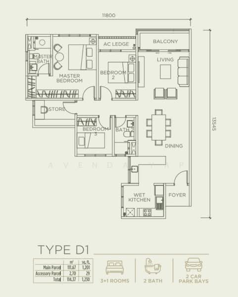 Type D1: 1,230 sqft