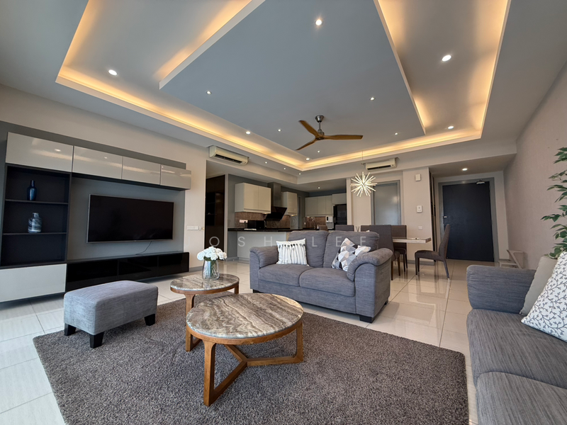 - Living Hall with Air-cond, fan, lights, TV, TV cabinet, Sofa set, Coffee table & Curtain