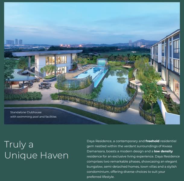Daya Residence (also known as Residensi Daya) is a contemporary, low-density freehold development nestled within the visionary 2,259-acre Kwasa Damansara township in Petaling Jaya, Selangor. Developed by the reputable TSR Development Sdn Bhd, this project offers a unique blend of modern lifestyle and natural serenity, making it an ideal generational investment. Scheduled for completion around 2026, Daya Residence provides a secure, gated and guarded environment for families to thrive. Set across 6.5 acres, Daya Residence is a low-density project featuring just 260 total units, ensuring privacy and a sense of exclusivity. The development is strategically located within Kwasa Damansara, a township celebrated for its vast green spaces, including 250 acres of parkland, 9 public parks, and 23 kilometers of cycling paths. The project is being developed in two phases, with the first phase offering spacious landed homes and a subsequent phase planned to include town villas and a condominium. The first phase of Daya Residence features a collection of premium semi-detached homes and an exclusive bungalow, designed for multi-generational living. Built-ups range from 3,329 sq ft to 3,971 sq ft. Offers an expansive built-up area of 5,004 sq ft. Residents will enjoy access to a comprehensive suite of resort-style facilities centred around a lifestyle clubhouse. Swimming pool and jacuzzi overlooking a serene lake. A fully-equipped gymnasium. Lakeside pathways, water decks, and a lakefront lounge. BBQ area, kid's pool, and playground. Multi-tier, 24-hour security for peace of mind. EV charging stations. The development boasts close proximity to two MRT stations, including the Kwasa Damansara MRT station, ensuring excellent public transport links. Superb connectivity via a network of major highways allows for easy travel. A variety of shopping and retail options are located nearby for everyday convenience and entertainment. Star Avenue Lifestyle Mall NSK Trade City Kota Damansara Giant Kota Damansara Strand Mall Sunway Giza Mall The area is home to numerous well-regarded educational institutions, catering to all levels. SK Seksyen 7 Kota Damansara SJK (C) Sungai Buloh Sri KDU Schools HELP International School & HELP University Daya Residence is a project by TSR Development Sdn Bhd, the property development arm of TSR Capital Berhad. The developer is based in Mutiara Damansara, Petaling Jaya, and has secured approval from Majlis Bandaraya Petaling Jaya for this project.