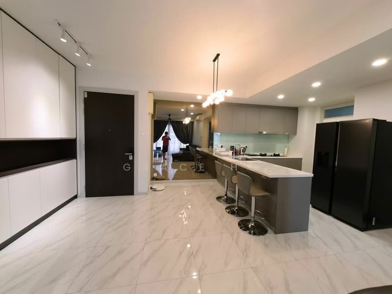 The expansive open layout effortlessly connects the living, dining, and kitchen spaces, while the contemporary kitchen island serves as a perfect gathering spot for casual meals or chats with family and friends.