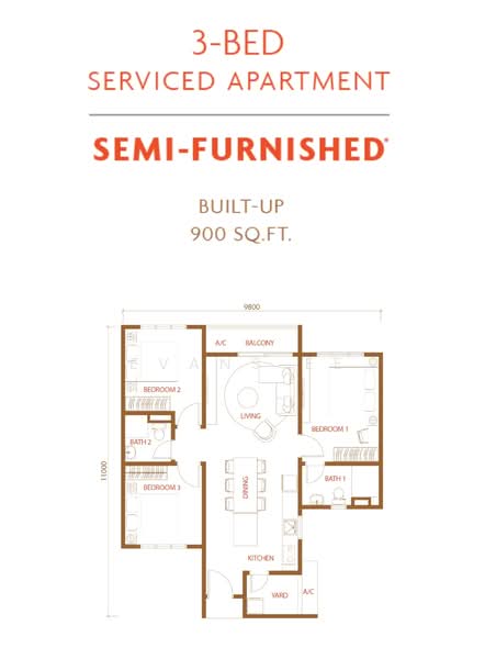 [ Type A • 900 Sqft • 3Room2Bath ]