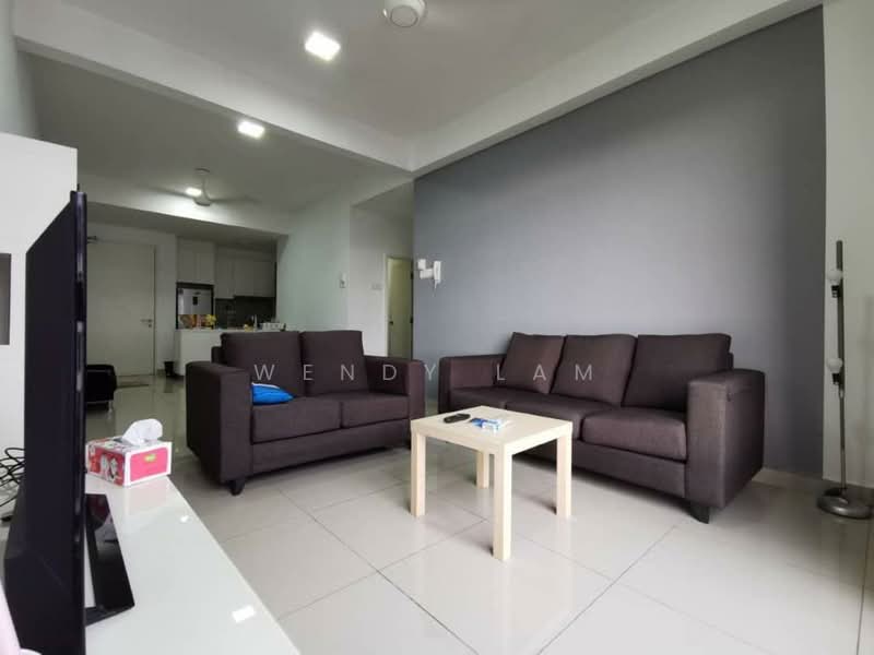 Living Area: Spacious open-plan layout featuring a cozy sofa set, coffee table, and TV console. Includes a stylish grey feature wall and elegant floor tiles.