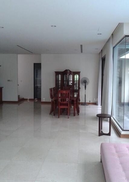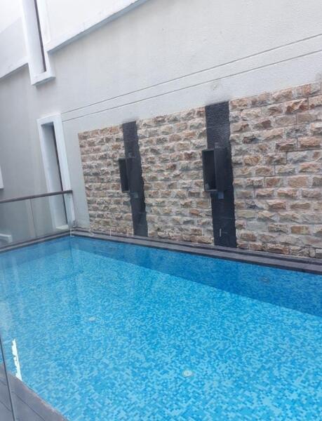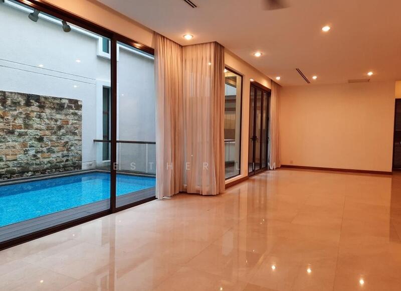 This three-story bungalow features a spacious living and dining area that overlooks the swimming pool, along with a second living hall, five bedrooms, a maid's room, and a modest garden.