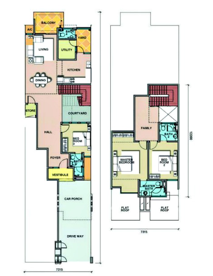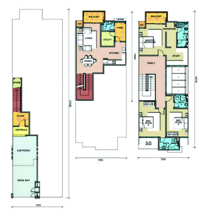 The 3 storey design is divided fairly at 1 storey and a half for both lower and upper options, sharing the same entrance stairs. There are four types offered, all having 3+1 bedrooms and 3 bathrooms, starting with Type A at 1953 square feet, Type A1 at 2118 square feet, Type B at 2267 square feet, and Type B1 at 2408 square feet. The dimensions range from 24ft x 90ft and 28ft x 90ft.