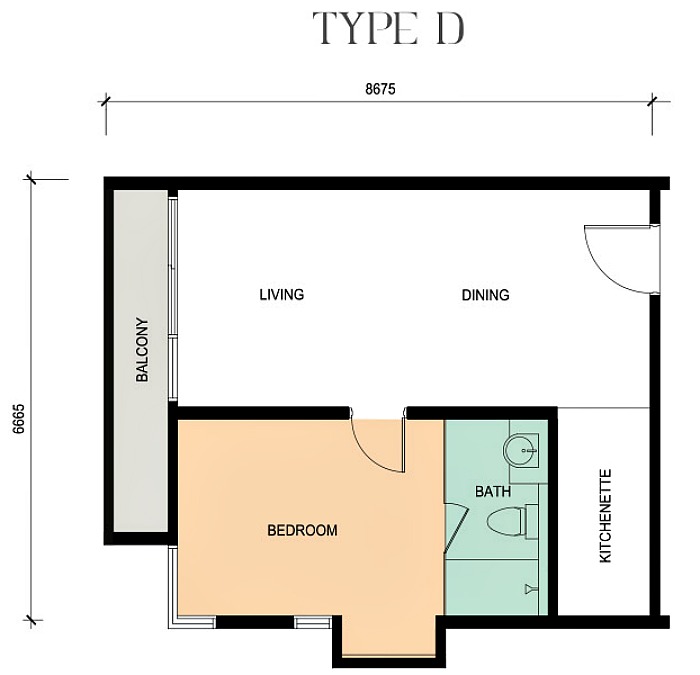- Type B – 861 sq ft – 1 room, 1 bathroom