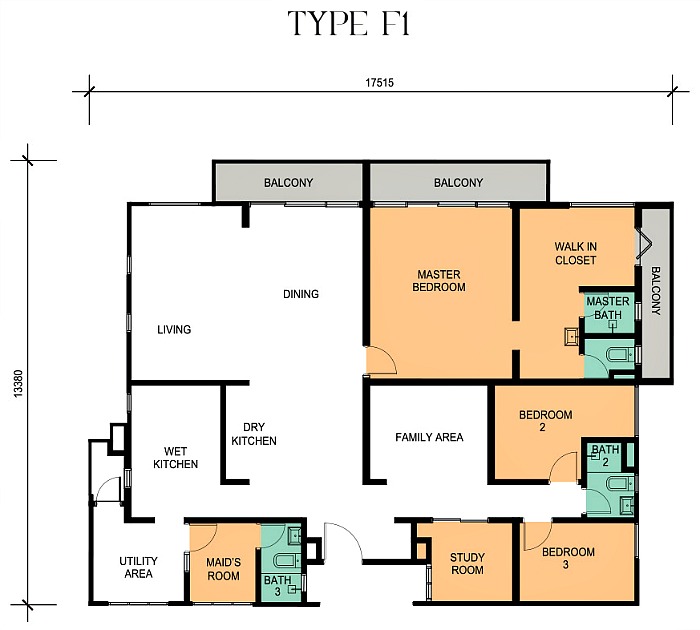 Type F1 comes in at 2,249 sq ft spotting three rooms and again a decent size study room to be turned into a bedroom though the lack of a window can make one feel a bit claustrophobic. There’s even a maid’s room next to the utility area, plus the master bedroom comes with a huge walk-in closet.
