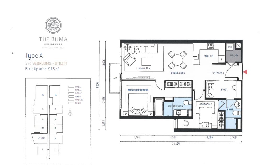 Type A 2+1 Bedrooms, 915 sq.ft.