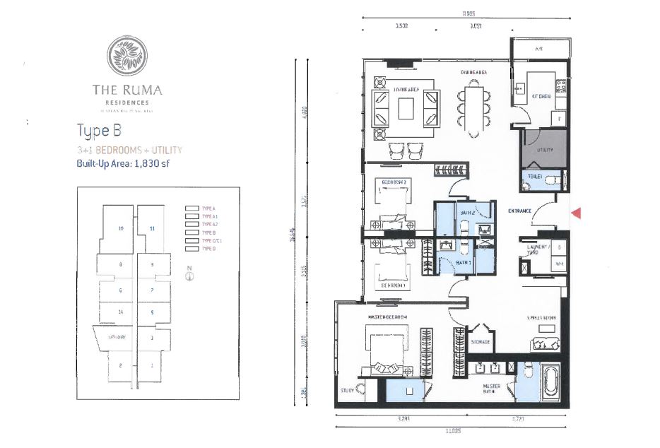 Type C 3+1 Bedrooms 1, 356 sq.ft.
