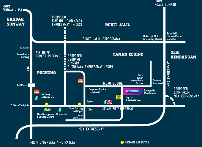 For further transportation convenience, the Serdang-Putrajaya MRT will be passing this way. There will be 2 MRT Stations here by 2021 and 2022, stopping by Taman Equine at Station 31 (S31) and further up at Giant Hypermart/The Atmosphere at S32. See map below.