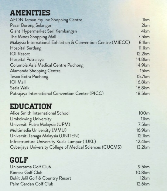 Or slip down to Persiaran Akademi Perdana via Persiaran Dr George Lim Ah Soo or Jalan Equine, travelling just 550 metres or 1 minute by car and you will join Jalan Putra Permai (an artery that leads to the SKVE and LDP) along which you will find Putra Walk, Pasar Borong Selangor, Giant Hypermart and the Atmosphere.