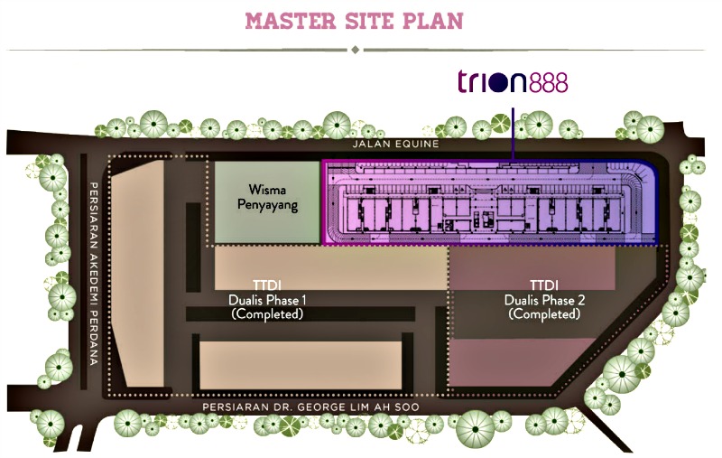 Trion888 marks the final phase of the 8.7 acre newly-completed TTDI Dualis business hub in the centre Taman Equine, Seri Kembangan. As can be seen in the picture, Trion888 is 1 block of 194 SoHo units above 40 Shop Offices and Shoplots.