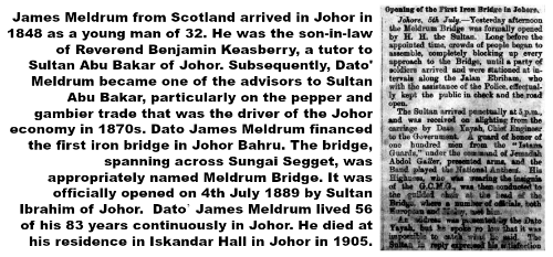 As you may have realised by now, the name Meldrum has been repeated many times, commemorating a road or a place in present-day Johor Bahru. This is because, like Wong Ah Fook, Dato’ James Meldrum also had an illustrious past, contributing much to the development of Johor.