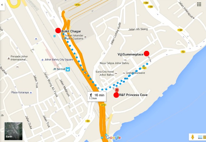 Further to that is the Singapore-Malaysia Rapid Transit System (RTS) scheduled to be up by 2018. The location of the stations have been identified to be at Bukit Chagar or/and at the site of R&F Princess Cove. Either or both locations are nearby. Take a look at the map below: