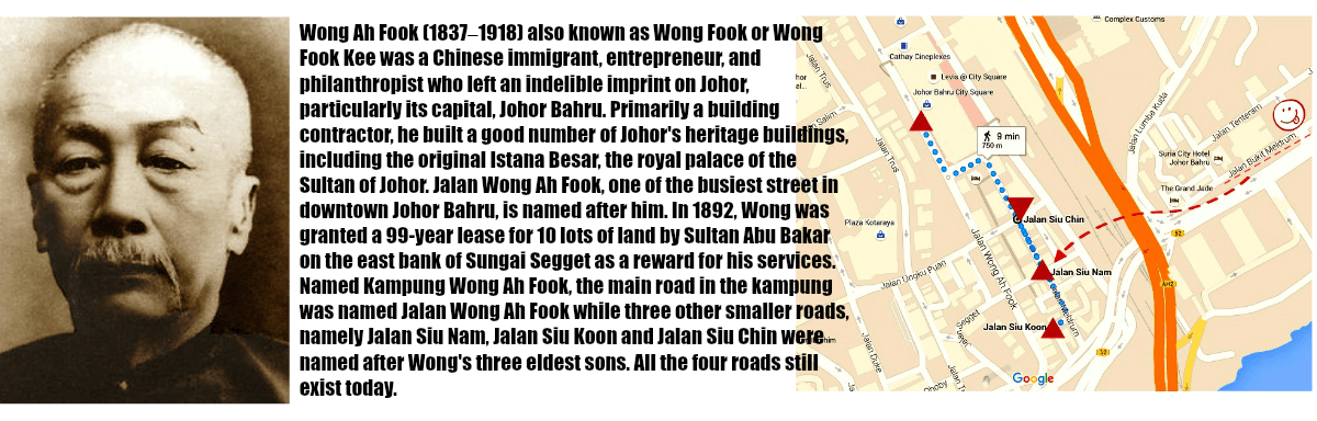 One of the more important figures and contributors to Johor’s history and heritage is Wong Ah Fook.That is why a road in downtown JB has been named after him. (Read his biography below).
