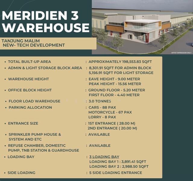 KOMPLEKS HAMODAL MERIDIEN 3 is a modern high-spec industrial warehouse strategically located within Proton City, Tanjung Malim, ideal for logistics, manufacturing, distribution, and new-technology operations. The property features excellent clear height, heavy-duty floor loading, strong power supply, and comprehensive loading facilities.