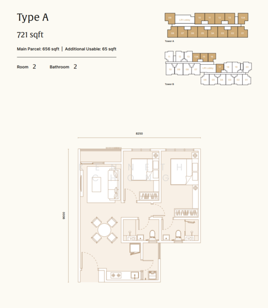 Type A: 721sqft (2 bedroom + 2 bathroom)