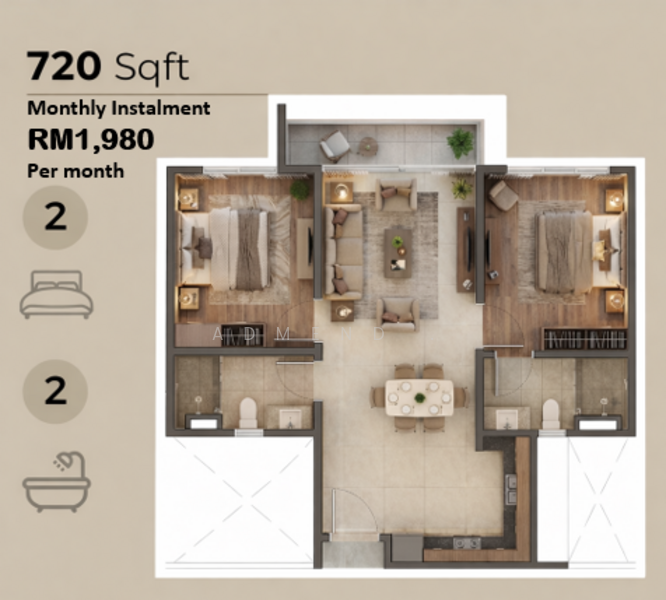 - 2 Rooms & 2 Bathrooms