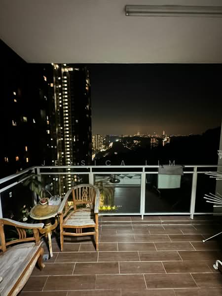 Living room with balcony showcasing a KL view, featuring the KL Tower and Twin Towers' stunning night lights and scenery.