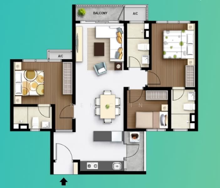 Type D (916sf): 3 Rooms, 3 Baths (With Balcony)