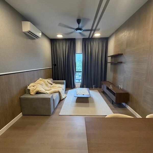 The living area is thoughtfully designed with built-in cabinetry and floating shelves, creating a sleek, functional space without wasted corners. Natural light filters in through full-height curtains, while the ceiling fan and air-conditioning ensure comfort throughout the day. The colour palette is restrained and mature — no loud finishes, no gimmicks.