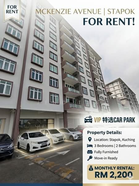 McKenzie Avenue is a contemporary leasehold mixed development located at Taman Stapok Lorong 5 in Kuching, Sarawak. Developed by Lee Onn Construction Company and completed around 2020, this property offers a blend of residential apartments and commercial spaces designed for modern living. The development is strategically positioned, providing residents with convenient access to a variety of amenities and key areas within Kuching. This development consists of four blocks, with two rising 9 storeys and two at 10 storeys, housing a total of 256 serviced apartments and 12 commercial units. The residential units at McKenzie Avenue feature a standardized and spacious layout of 1,520 sq ft, which includes 3 bedrooms and 2 bathrooms. Each unit is allocated two parking spaces. Residents have access to a comprehensive range of facilities designed for security and recreation, including:24-hour gated and guarded security with a card access system and CCTV monitoring Swimming pool Gymnasium Function rooms Children's playground McKenzie Avenue is located a short drive from several major retail centers, offering a wide array of shopping and grocery options. Nearby malls include Wisma Saberkas (1.8 km) and Boulevard Shopping Mall. Aeon Mall Kuching Central and the MJC New Township are also noted as being close by. The property is suitable for families, with several schools in the vicinity such as SJK (C) Chung Hua No. 6 and SMK Sg Maong. Access to medical care is convenient, with Timberland Medical Centre and Sarawak General Hospital located nearby. Klinik Kesihatan Batu Kawa is also easily accessible. McKenzie Avenue is a project by Lee Onn Construction Company, which launched this mixed development at Stapok Utara.