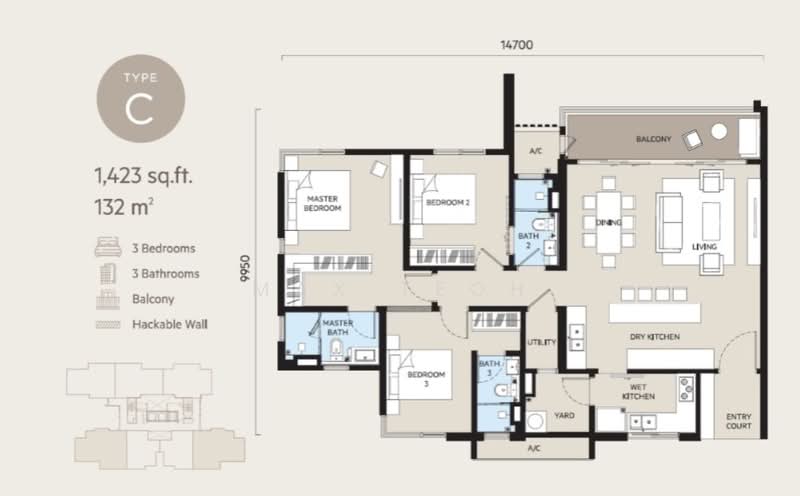 Type C | 1,423 sq.ft 3 Bedrooms • 3 Bathrooms • 3 Car Parks