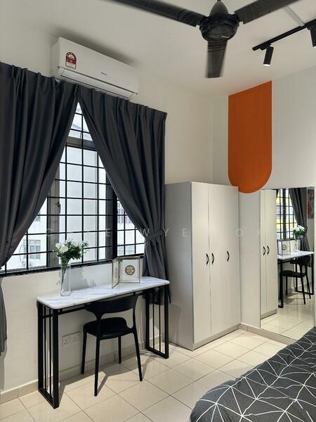 FULLY FURNISHED (bed, mattress, wardrobe, fridge, washing machine, kitchen, air conditioning, water heater), just bring your clothes for moving in. 24-hour security, lift facilities, shops, surau.