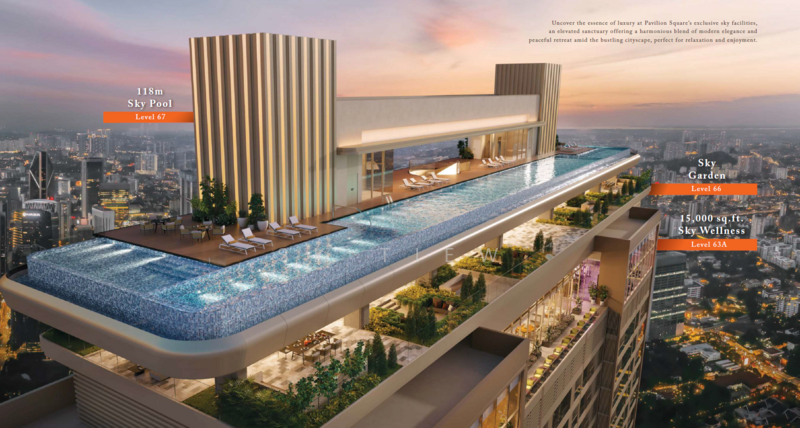 Pavilion Square is a prestigious leasehold integrated development poised to become a new landmark in the vibrant heart of Bukit Bintang, Kuala Lumpur. Developed by the renowned Pavilion Group, this project is strategically situated on 2.02 acres at the bustling intersection of Jalan Raja Chulan, Jalan Bukit Bintang, and Jalan Imbi. With an anticipated completion date around 2028-2029, Pavilion Square seamlessly blends luxury residences, corporate suites, and retail outlets into a comprehensive urban hub. Pavilion Square consists of two towers: a 67-storey residential block and a 25-storey office tower. The development offers 960 fully furnished residential units, 106 corporate suites, and 6 exclusive retail lots. The residential units are designed with modern and functional layouts to suit various lifestyles, ranging from studios to three-bedroom suites. 504 sq ft 770 - 772 sq ft 966 - 1,272 sq ft 1,255 sq ft The development includes strata office suites ranging from 1,094 sq ft to 2,464 sq ft, alongside a collection of retail stores for added convenience. Residents have access to over 70,000 sq ft of lifestyle facilities designed for luxury and wellness. The standout feature is a dedicated link bridge providing direct access to the iconic Pavilion Kuala Lumpur mall. Key amenities include:A 118-meter rooftop infinity pool, the longest in KL City Centre. A 15,000 sq ft Sky Wellness zone, the largest in the city, with indoor and outdoor gyms, sauna, and steam rooms. A Barbeque Area, Jacuzzi, landscaped gardens, and a multi-purpose hall. 24-hour security and concierge services. Nestled within Kuala Lumpur's Golden Triangle, Pavilion Square offers unparalleled connectivity and access to a wealth of amenities. A dedicated link-bridge connects residents directly to Pavilion Kuala Lumpur for world-class retail, dining, and entertainment. The development is approximately 900m from Tun Razak Exchange (TRX) and 1.3km from KLCC. The area is served by multiple transit stations, including the Monorail stations at Raja Chulan and Imbi, as well as MRT stations for Bukit Bintang and Conlay. Prince Court Medical Centre (1.1km away). Beverly Wilshire Medical Centre. Etonhouse International School Malaysia. INTI International College Kuala Lumpur. Pavilion Square is a flagship project by Pavilion Group, a well-established Malaysian property developer known for creating premium, large-scale retail and integrated mixed-use developments in prime city locations across Malaysia and China.