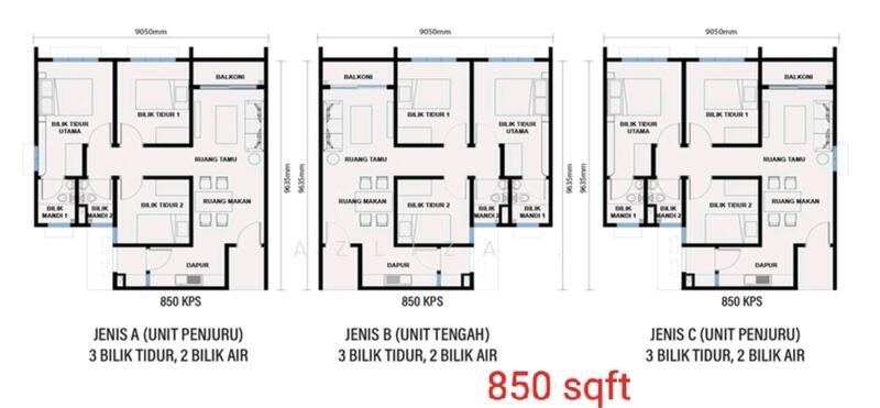 Keluasan: 850 sqft (balkoni)
