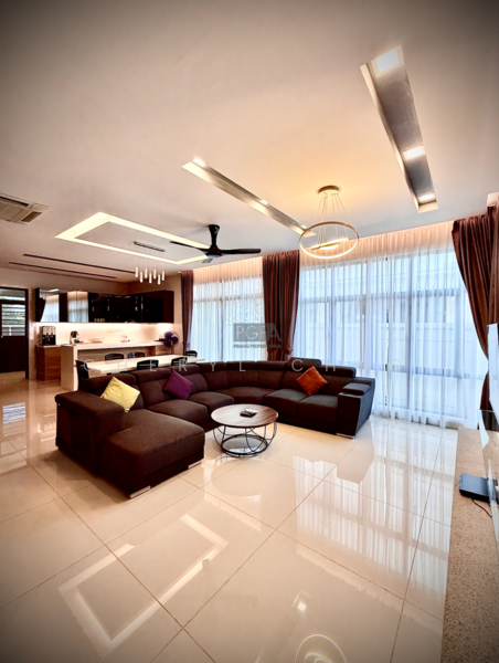 The home boasts high-end specifications and interior design, featuring 12’/11’ high ceiling rooms, luxurious 800 x 800mm floor tiles in the grand living and dining room, and top-of-the-line Panasonic Sky-/Aero-series air conditioning systems in all rooms. The widely-covered car porch can accommodate up to three cars, and the outdoor garden cum patio is perfect for relaxing or entertaining.