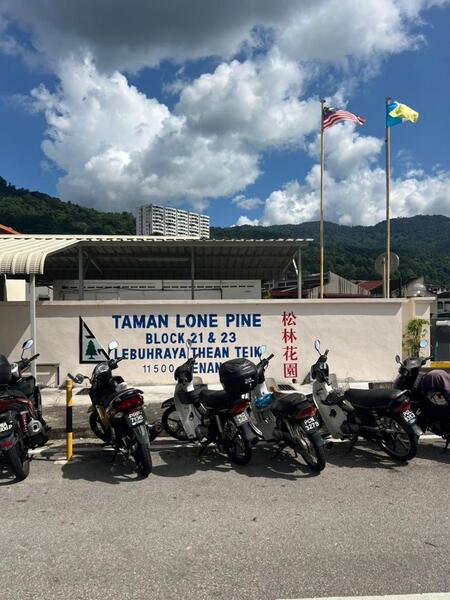 Taman Lone Pine is a freehold, medium low-cost condominium located at Block 21 - 23, Lebuhraya Thean Teik, Paya Terubong, 11500 Ayer Itam, Penang, Malaysia. There are 256 units housed within 2 blocks of 14 and 4 stories respectively. There are 16 units per floor in the high-rise block and 6 units per floor in the low-rise block. The built up size is approx. 700 sqft per unit in the high-rise block and 800 sqft per unit in the low-rise block. Facilities provided are a swimming pool, playground, car park and 24 hours security. There are a few schools in the area such as SJK(C) Kong Min 2 (0.99km) and SJK(C) Chiao Nan (1.23km) that are a short drive away. Other amenities in the area are Lone Pine Club which is just across the road and Billion supermarket just behind that. Residents also have a few shops, food stalls as well as a MacDonald's that are a short walk away. Taman Lone Pine is situated between Lebuhraya Thean Teik and Jalan Paya Terubong.