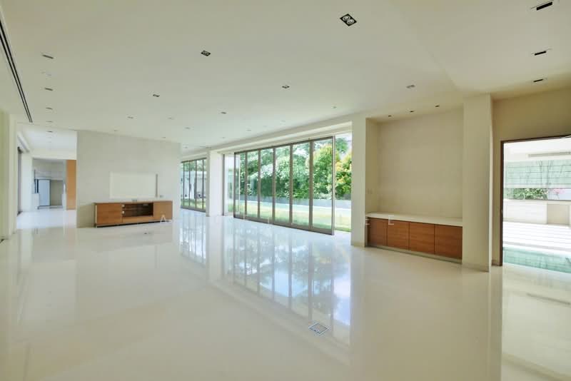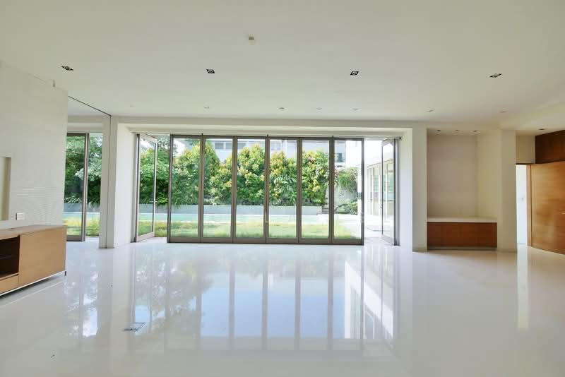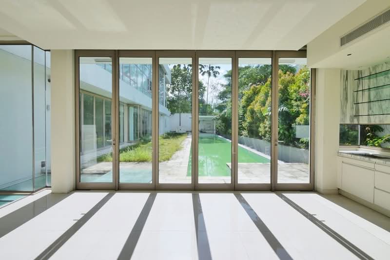 The grand open-plan living areas are impressive, featuring full-height sliding glass panels that bathe the interior in natural light and seamlessly connect to the lush outdoor spaces.
