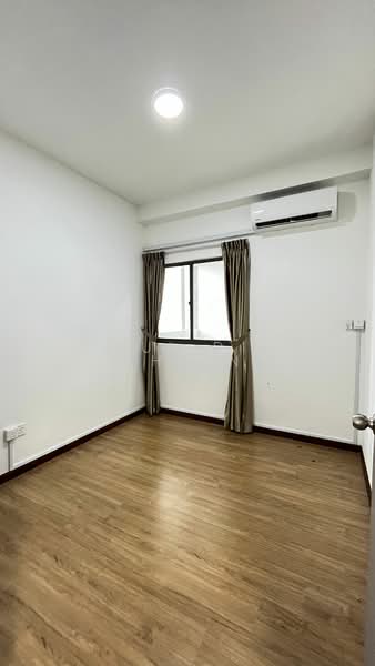 The bedroom remains serene and uncluttered, equipped with split-unit AC and large windows to capture the morning light. In the bathroom, a bold charcoal-tiled shower zone provides a sharp, contemporary contrast to the white sanitary ware and neutral walls.
