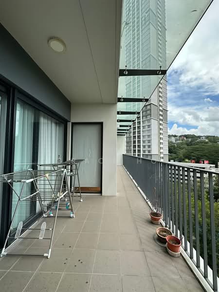 The extended balcony links the living area and master bedroom, both offering direct access.