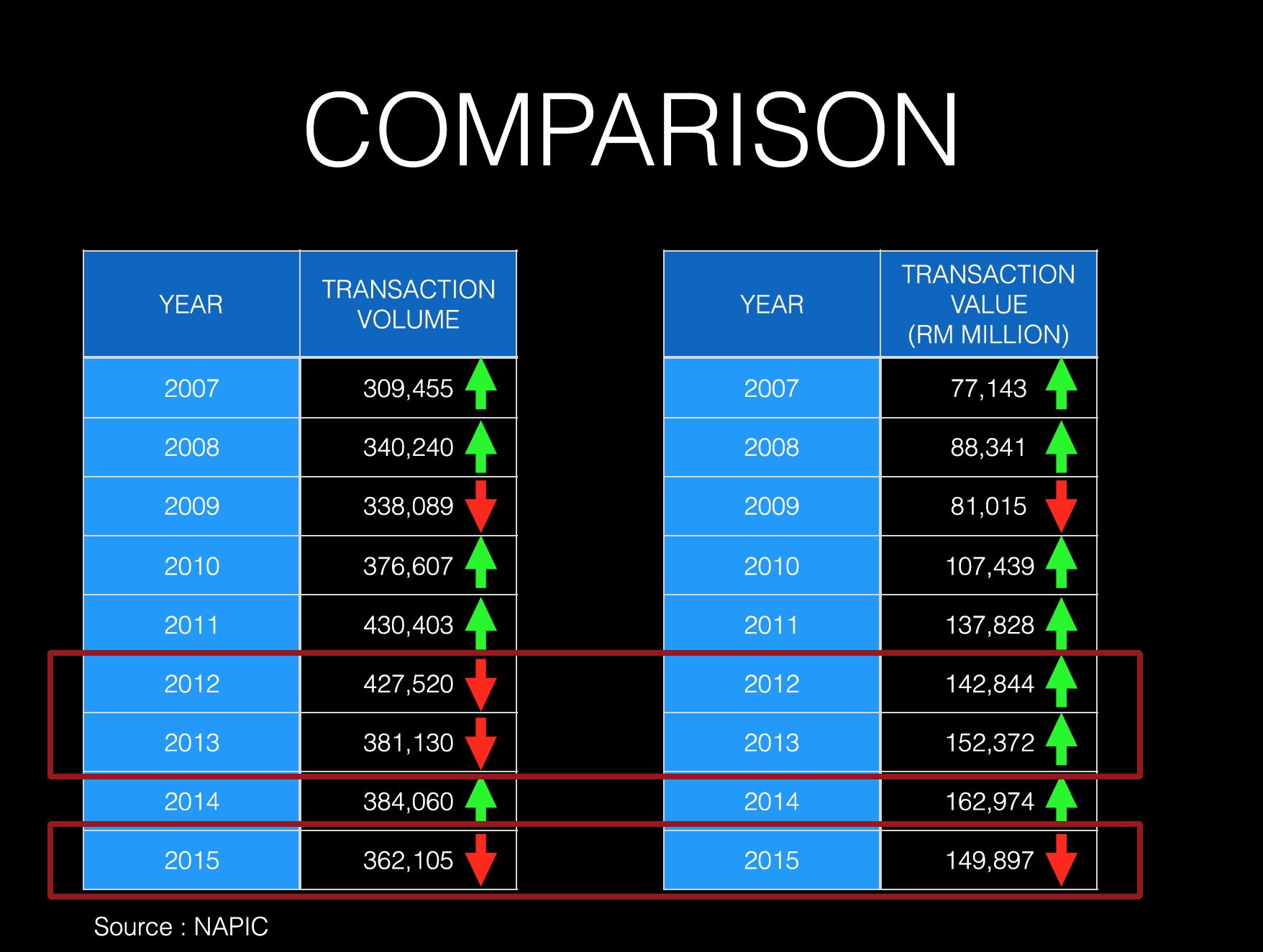 In terms of value, residential property transactions dropped by 10.47% in 2015, following strong increases of 13.88% in 2014, and 6.34% in 2013.