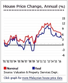 House prices in Malaysia have slowed. In Q3 2016, Malaysia’s national house price index rose by 5.36% y-o-y (3.81% inflation-adjusted), slightly lower than the 7.35% y-o-y (4.61% inflation-adjusted) price increase during the same period last year. This was the lowest increase since Q3 2009, based on figures from the Valuation and Property Services Department (JPPH).