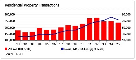 In Q3 2016, the total number of residential property transactions fell by 13.91% to 49,640 units, or 11.96% by value, from a year earlier, according to the Valuation and Property Services Department (JPPH). Residential transactions accounted for 64.9% of all property transactions in Q3 2016.